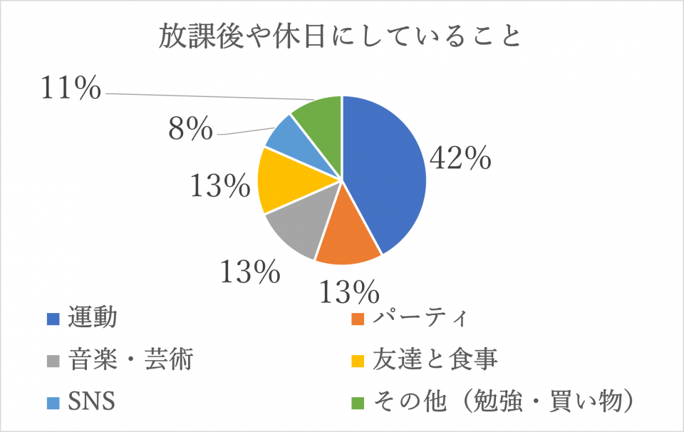 また、最も多かった回答は「運動」でしたが、日本の部活動のように真剣に取り組むというよりは、気分転換として体を動かしている印象を受けました。