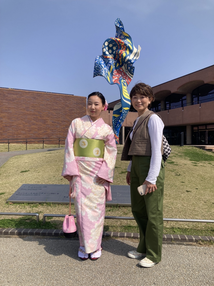「着物体験」では、慣れない着物で大濠公園と日本庭園を散策しました。アメリカの高校の授業で学んだインカ・ショニバレのアートを見つけて写真撮影、美術の先生に報告したいと笑顔でした。
