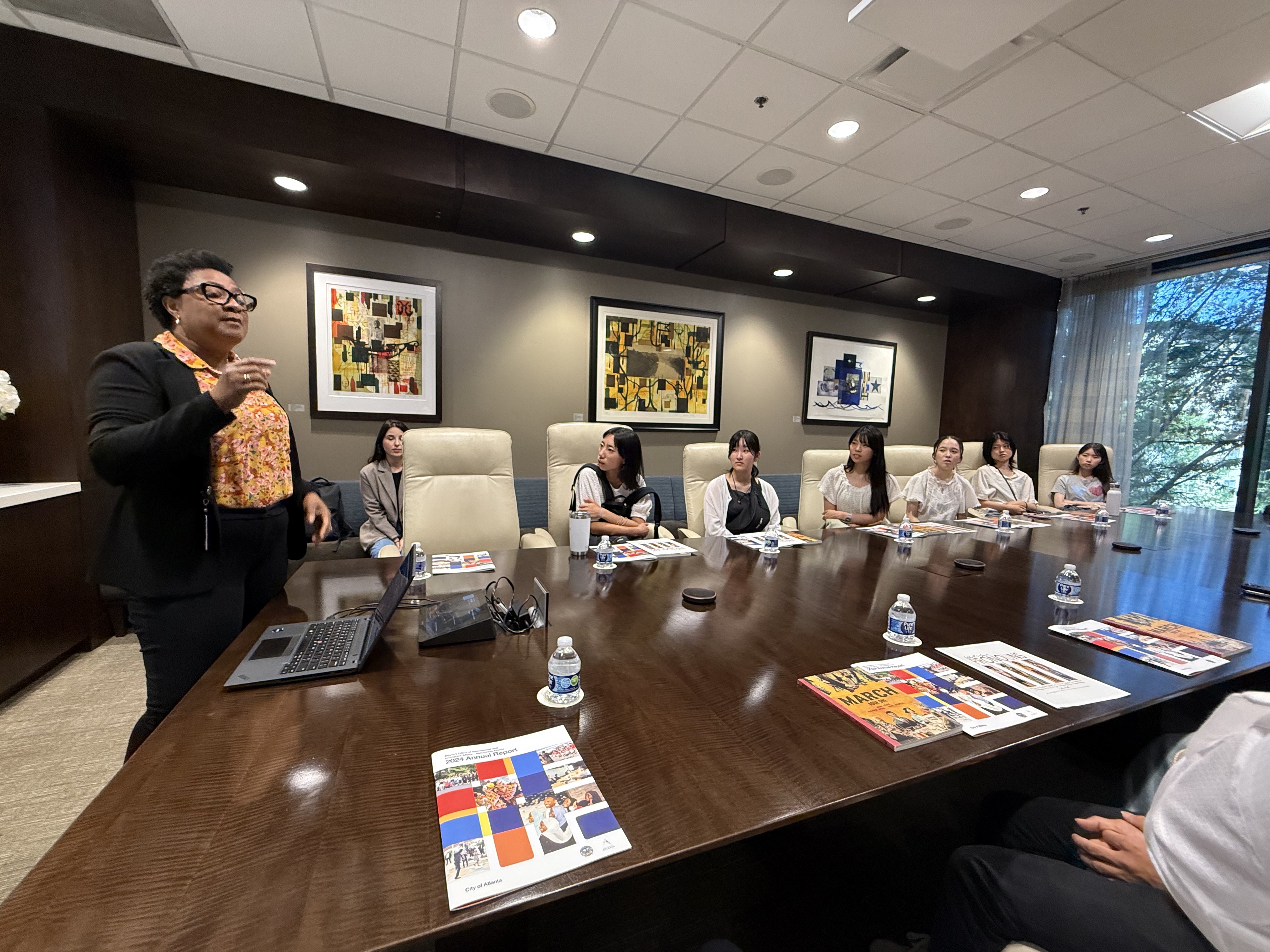 19日はまず、アトランタ市役所を訪問し、市政の仕組みや地域社会への取り組みについて学びました。団員たちは国際・移民担当のシニアマネジャーなどの市職員との意見交換や質疑応答に参加し、アメリカの政治や行政への理解を深めました。市役所視察の際に、アトランタ市のアンドレ・ディケンズ市長にもお会いし、お話をさせてもらいました!